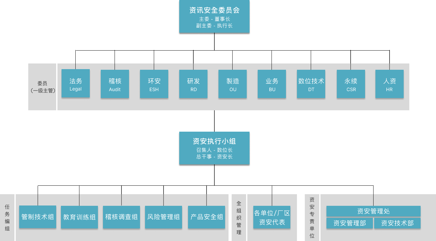 资讯安全委员会为3499拉斯维加斯资安最高管理组织,向董事长报告。下辖资安执行小组负责推行资讯安全委员会之各项决议。为持续建构完整且精实的资安专 责团队,资讯安全管理处下成立「资讯安全管理部」与「资讯安全技术部」,持续投入资源以强化团队资安核心能力。