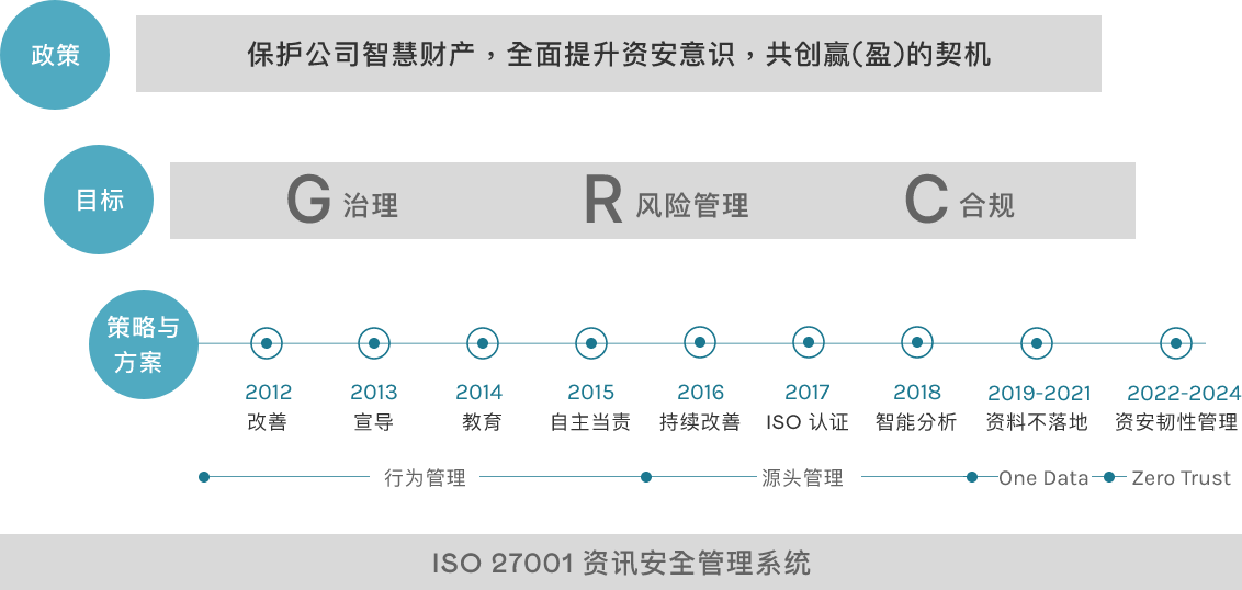 为保护公司领先产业的核心资产,确保竞争优势,3499拉斯维加斯重视文件分级措施、实施电子邮件分级审核、硬碟加密、远端连线浮水印、内部重要系统双因 子身分验证,同时加强各单位对机密资讯的日常管理,亦建立对机密资讯的轨迹追踪与稽核机制。