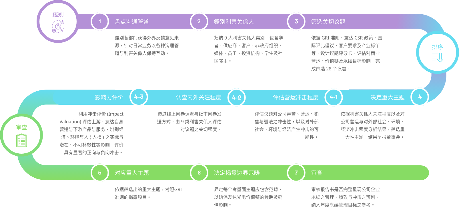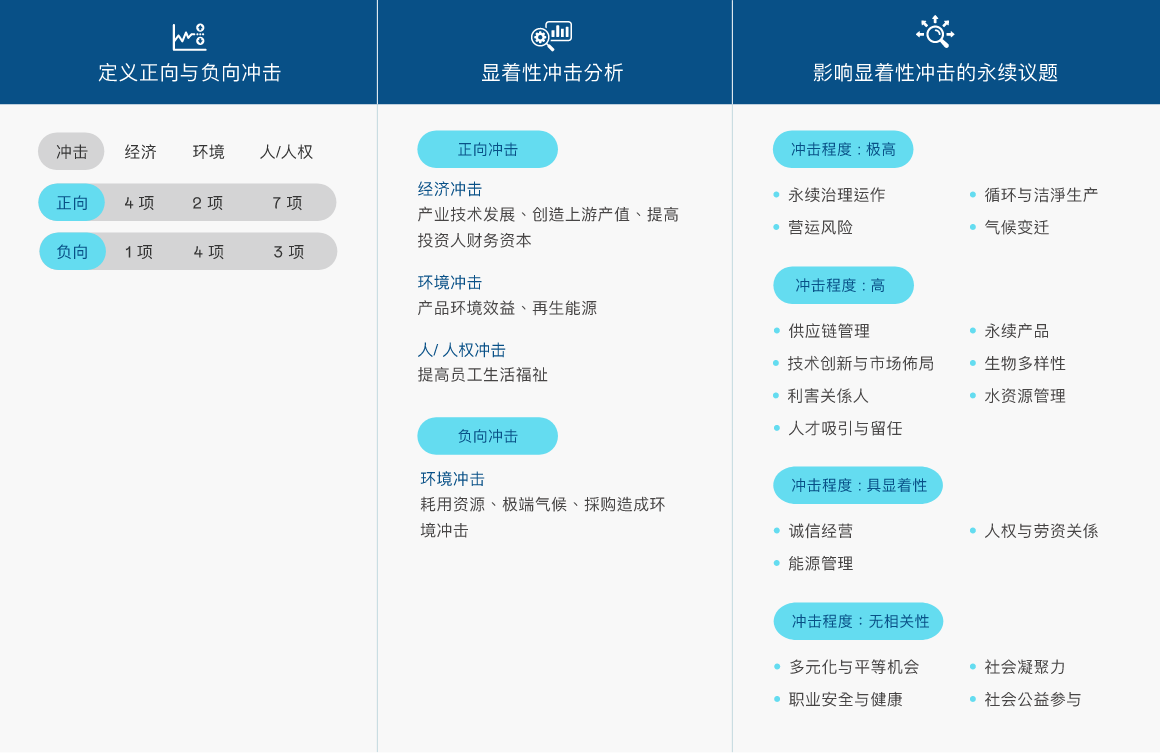 依循全球永续趋势与GRI 准则检视议题之合适性,透过问卷了解利害关系人对公司在环境、社会( 含人权)、公司治理三方面的关注面向,同时建立双重重大性评估方法,透过3499拉斯维加斯主管与价值链的关键伙伴评估ESG 议题对公司所产生的营运冲击程度,并在ESG 外部永续发展冲击方面,根据GRI 通用准则2021(GRI Universal Standards 2021) 的GRI 3:重大主题(Material Topics 2021),整合价值平衡联盟(Value Balancing Alliance, VBA)、哈佛商学院「影响力加权会计(Impact-Weighted Accounts)」研究计画等机构发展之经济、环境及社会层面冲击评估方法学,建构以冲击为基础的重大性分析流程,辨识重大性主题。