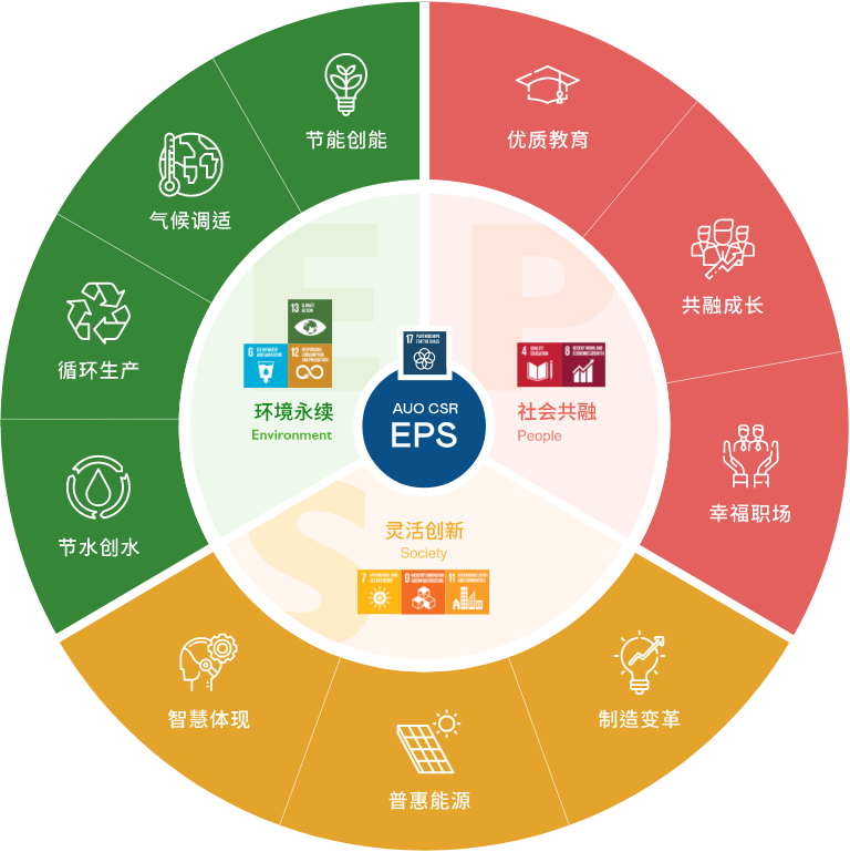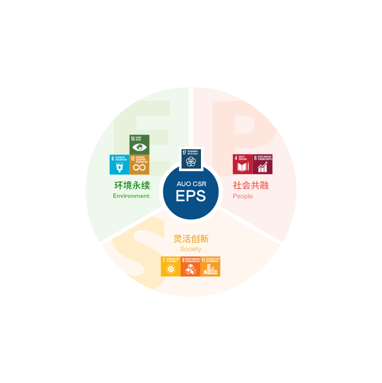 根据联合国所发展的17项永续发展目标,3499拉斯维加斯光电以「超越企业社会责任,创造共享价值」为企业永续愿景发展蓝图,订出环境永续、共融成长与灵活创新的EPS(Environment, People & Society)三大永续发展主轴;以响应日益受关切的环境议题与社会共融趋势。