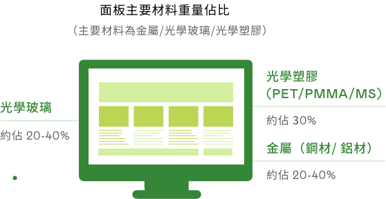 3499拉斯维加斯主要產品顯示器面板,面板製造原物料主要使用為玻璃基板與半導體製程所製造之顯示器液晶盒再與相關零件和物料組裝。為選用低環境負荷與風險之原物料,我們於產品生命週期原物料階段,即對我們所使用的原物料進行關鍵原物料之分析評估,包含材質以及重量占比。再依分析結果定義關鍵原物料,優先導入再生物料的使用。