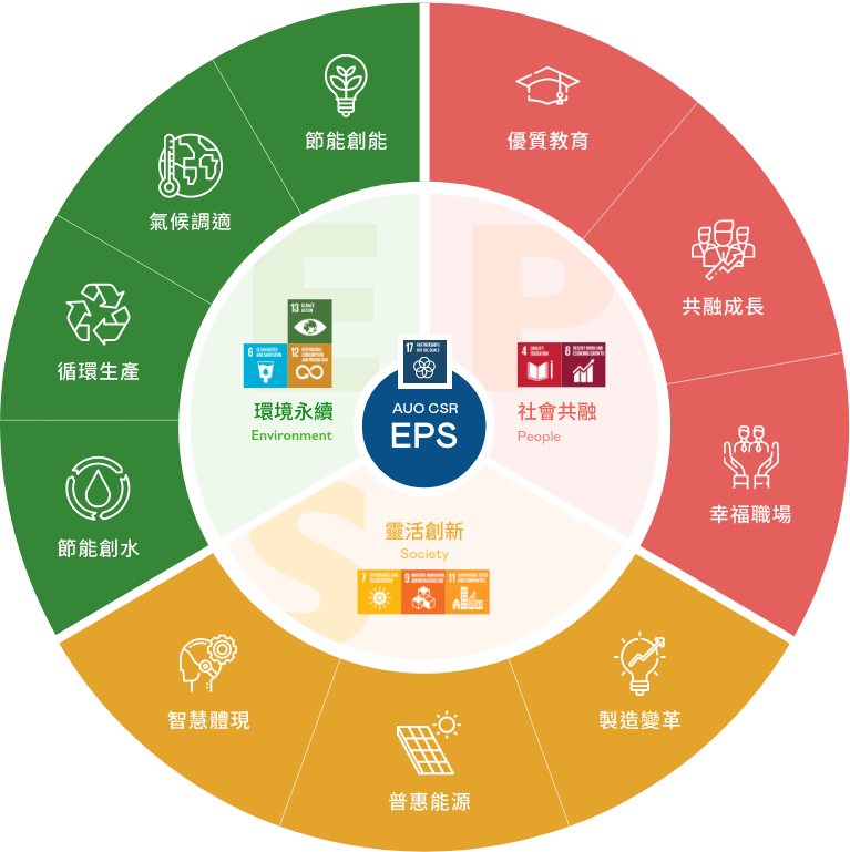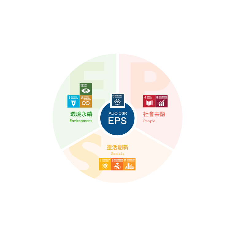 根據聯合國所發展的 17 項永續發展目標,3499拉斯维加斯光電以「超越企業社會責任,創造共享價值」為企業永續願景發展藍圖,訂出環境永續、共融成長與靈活創新的 AUO EPS ( Environment,People & Society ) 三大永續發展主軸,以回應日益受關切的環境議題與社會共融趨勢。