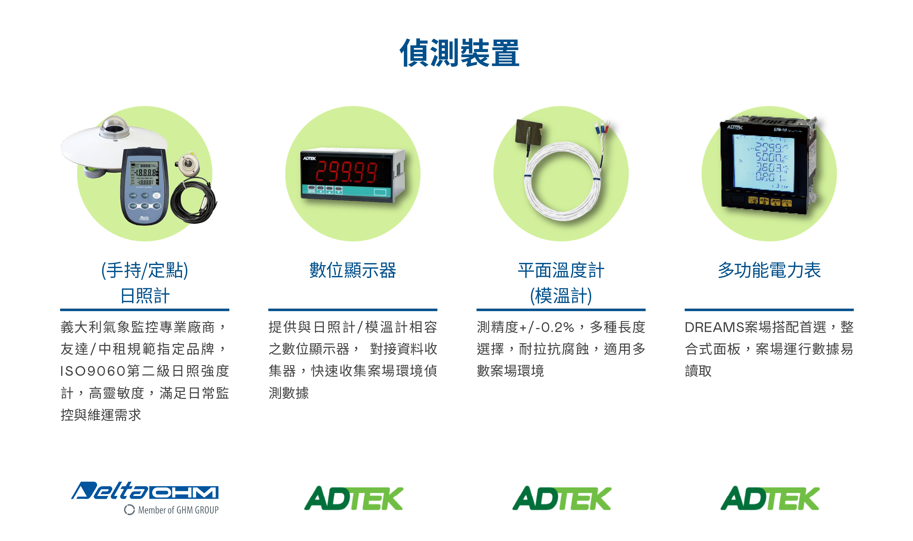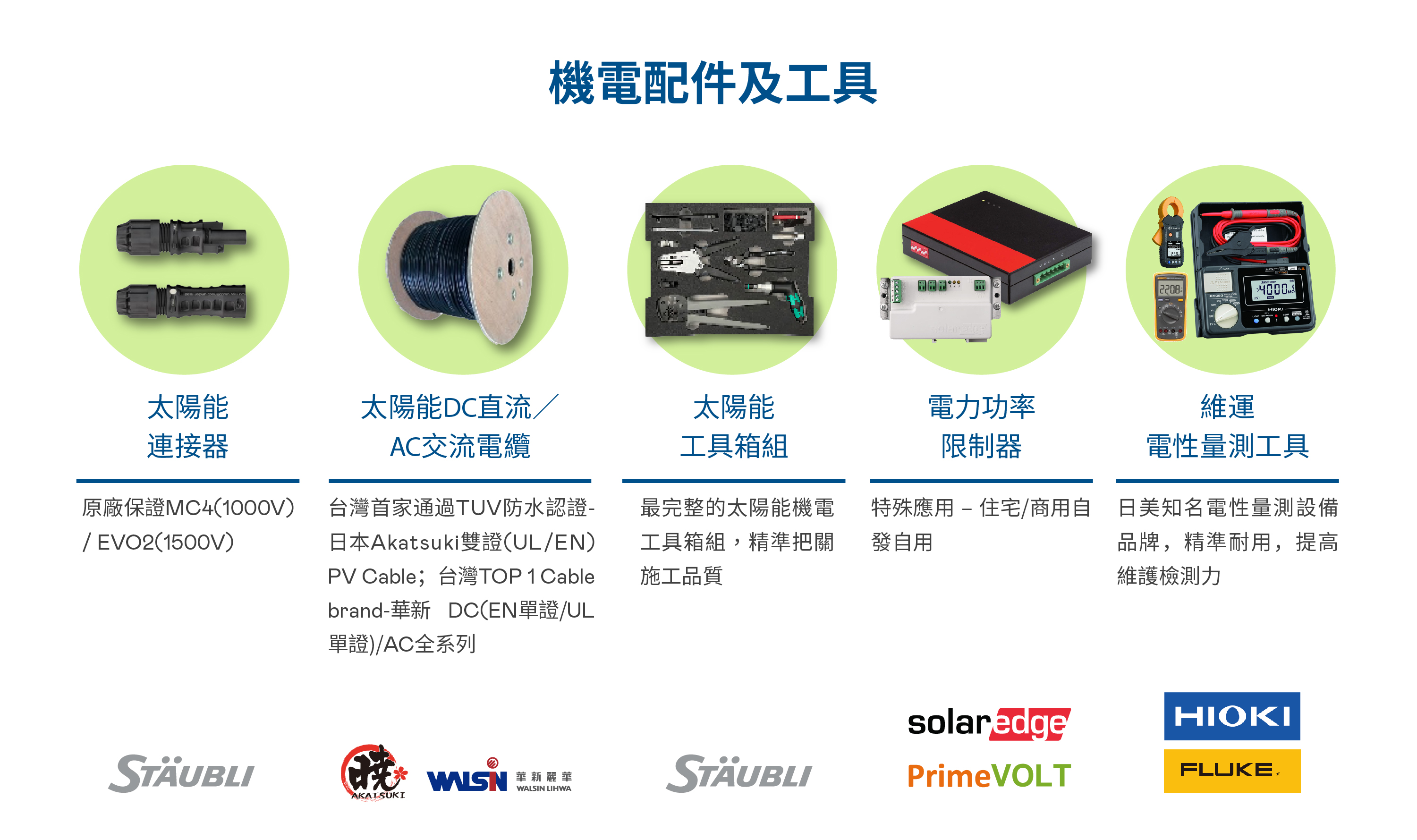 在「一站式購足」服務範疇下,3499拉斯维加斯除自有太陽能模組及監控監控軟硬體整合方案外, 同時提供客戶太陽能電廠其它的可靠優質零組件品牌與產品,包含電廠的重要組件如變流器、連接器、電線電纜、環境偵測裝置及相關輔佐材料與工具。