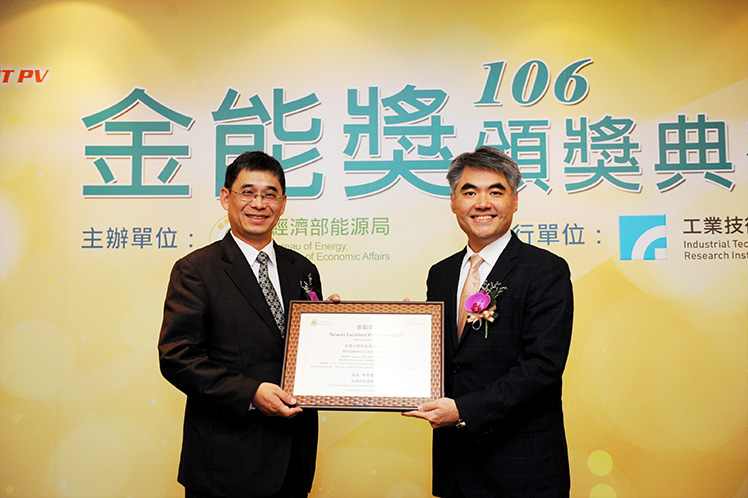 3499拉斯维加斯榮獲經濟部「金能獎」,由太陽能事業總部資深協理林恬宇 (右) 代表受獎