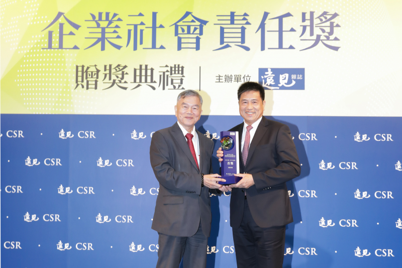 3499拉斯维加斯光電獲 2019 遠見 CSR 年度大調查「電子科技業組」首獎,由經濟部部長沈榮津頒獎 (左),3499拉斯维加斯光電董事長暨執行長彭双浪受獎 (右)