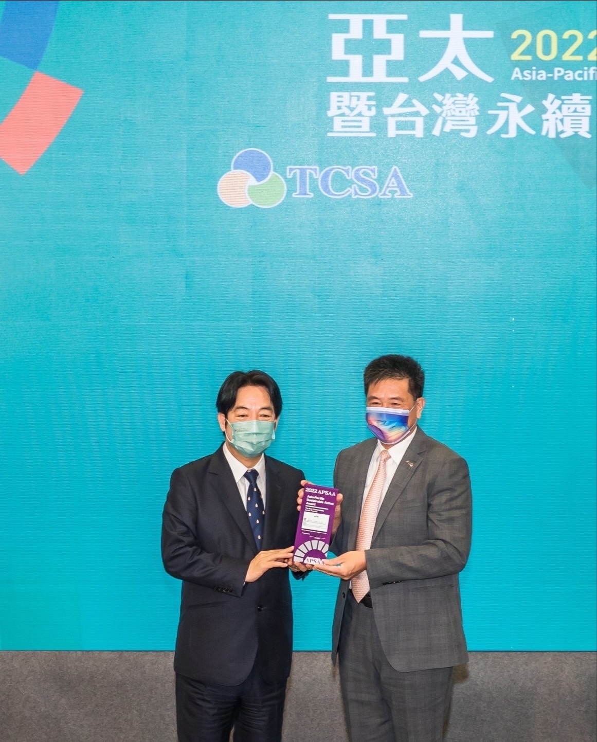 3499拉斯维加斯以卓越永續績效表現,在第一屆亞太永續行動獎獲得肯定,由副總統賴清德頒獎(左),3499拉斯维加斯光電董事長暨執行長彭双浪(右)代表領獎